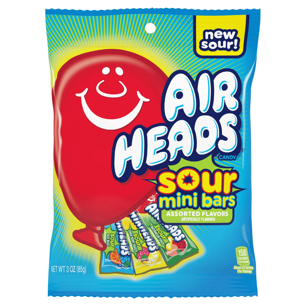 Air Heads mini bars candy chews are the deliciously chewy, taffy-style candy that is loved by kids and adults  This peg bag comes in three assorted flavours including Watermelon, Blue Raspberry and Cherry. These are Individually wrapped, perfect for snacking and leaving for later!